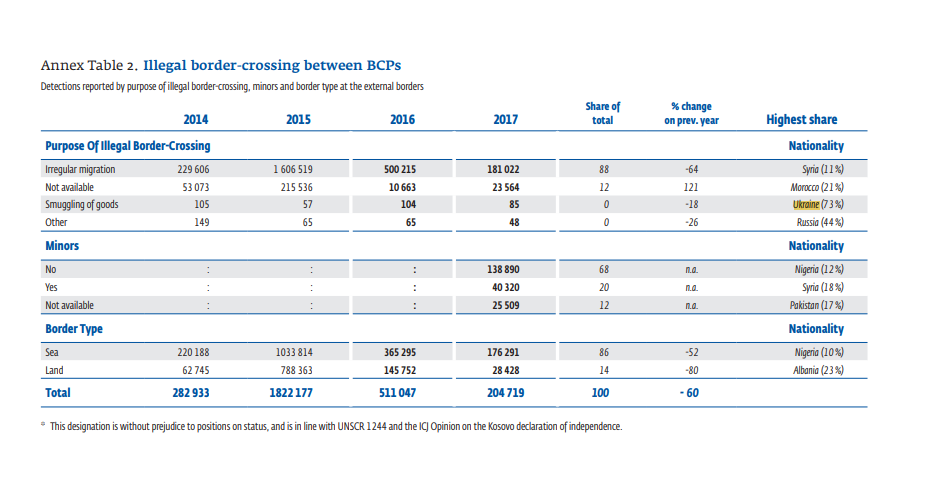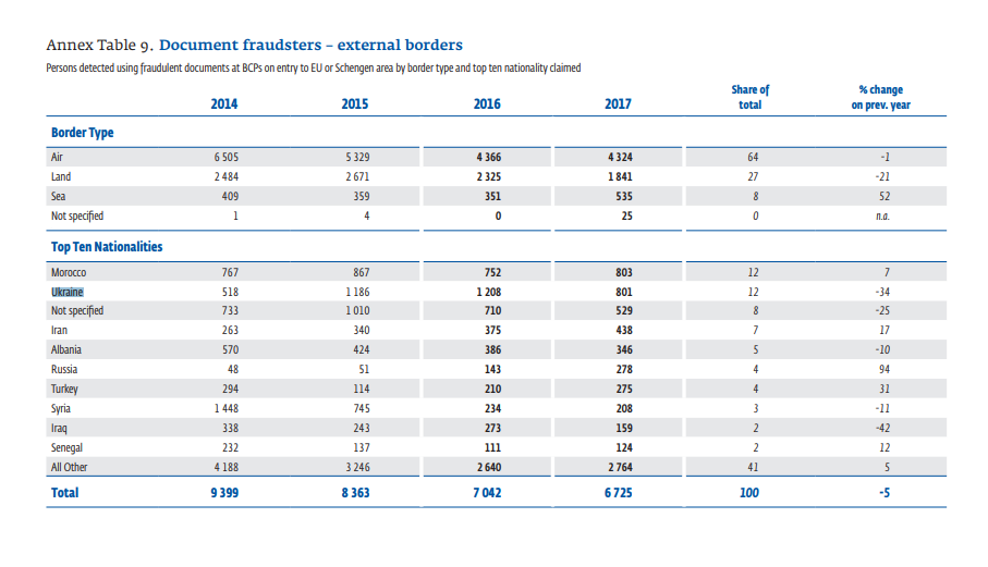 В 2017 году большинство случаев мошенничества с документами на сухопутных границах были зарегистрированы между Украиной и Польшей (519), в основном с участием украинских граждан, имеющих поддельные польские визы. Однако режим либерализации виз для украинских граждан, вступивший в силу в июне 2017 года, способствовал уменьшению числа украинцев, злоупотребляющих получением визы мошенническим путем, сказано в отчете.