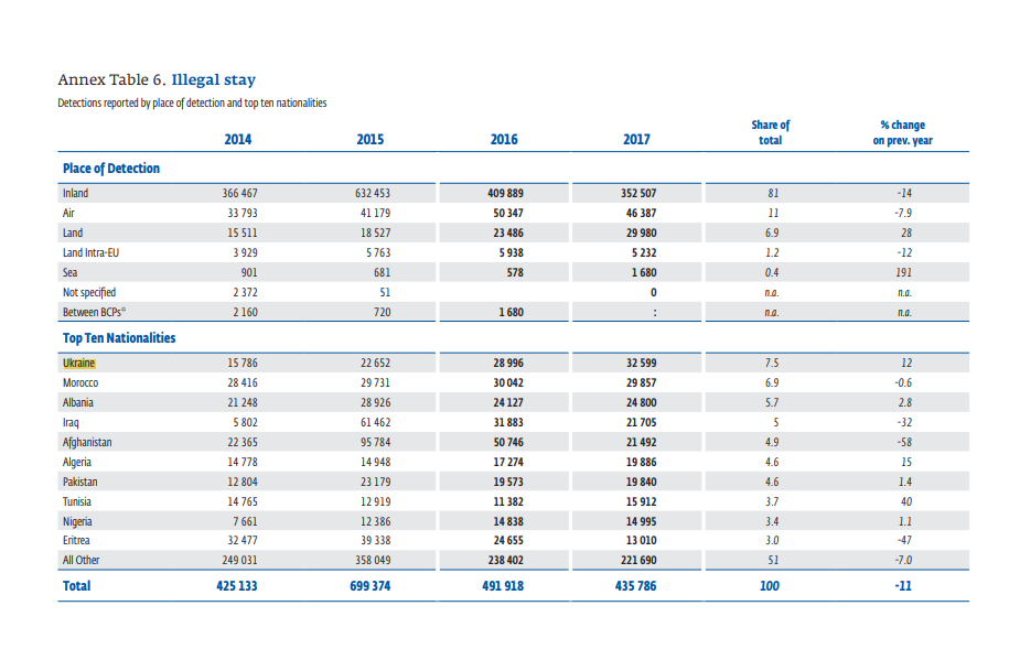Украина занимает первое место в десятке стран по нелегальному пребыванию в ЕС - 32 599 случаев за 2017 год, причем это число с годами стабильно растет. Хотя еще в прошлом году Украина уступала пальму первенства Афганистану.