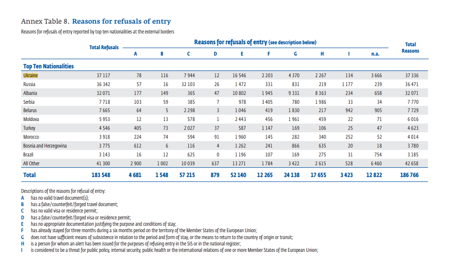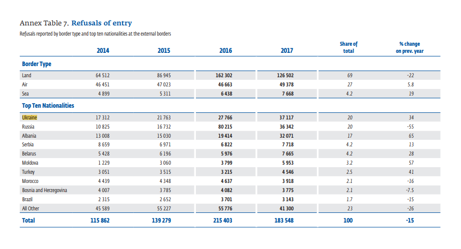 Также Украина возглавляет ТОП стран по отказам во въезде - 37 117 отказов за 2017 год. Это на 10 тысяч отказов больше, чем годом ранее, когда Украина еще не получила безвизовый режим с ЕС. Следом за Украиной идут Россия и безвизовая Албания. Хотя еще в прошлом году в лидерах была Россия с 80 тысячами отказов.