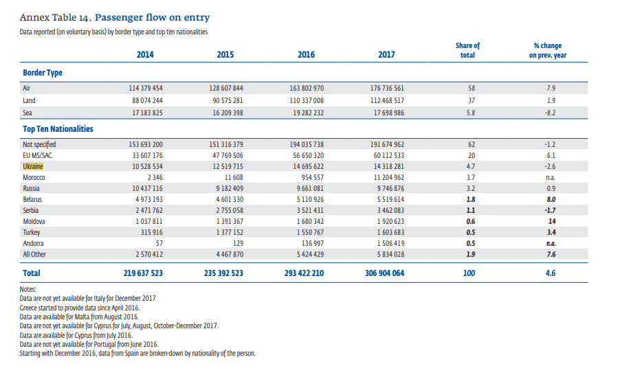 Решение о либерализации визового режима с Украиной аналитики Frontex называют "наиболее значимым". За три месяца после либерализации визового режима (июль-сентябрь) размер пассажиропотока украинцев в Шенгенскую зону увеличился на 15% по сравнению с тем же периодом год назад, отмечают аналитики Frontex. Впрочем, по сравнению с прошлым годом пассажиропоток в 2017-м наоборот снизился - на 377 тысяч человек (с 14 695 622 в 2016 году до 14 318 281 в 2017-м).