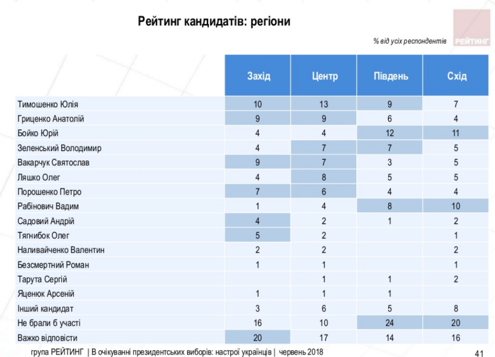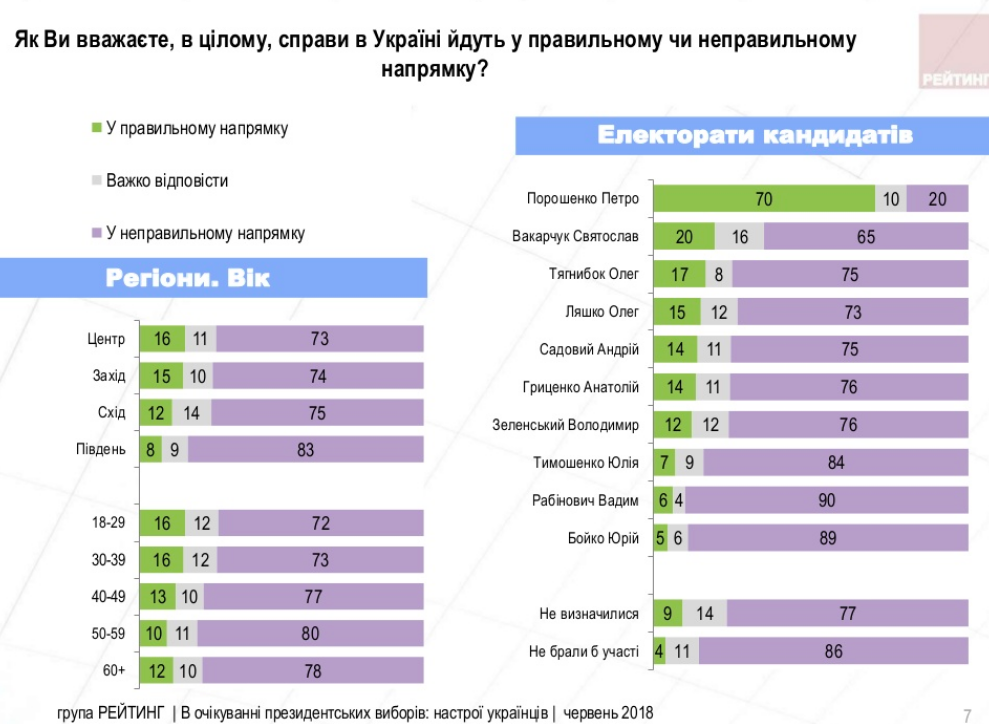 Электорат трех политиков - Тимошенко, Рабиновича и Бойко - в большинстве своем (этот показатель доходит до 90%) считают, что ситуация движется в неправильном направлении. Сторонники шести политиков - Вакарчука, Тягнибока, Ляшко, Садового, Гриценко и Зеленского - дают более оптимистичные оценки.