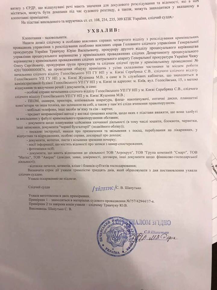 В постановлении следственного судьи годичной давности, которая давала разрешение на проведение обысков в рабочих кабинетах полицейских Жушмана и Серебряка, давался более подробный расклад "дела Трояна".