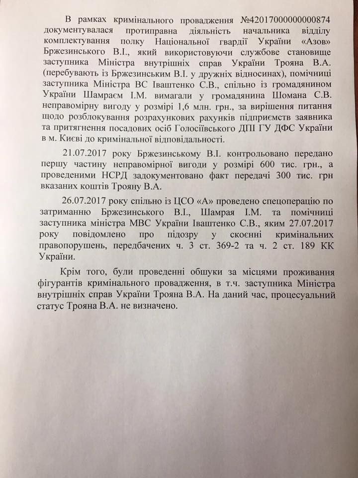 На следующий день им было объявлено о подозрении в вымогательстве (ч.2 ст.189 УК Украины) и злоупотреблении влиянием (ч.3 ст.369-2 УК Украины). При этом, у самого замминистра внутренних дел был проведен обыск, но процессуальный статус Трояна в скандальной истории на тот момент так и не был определен.