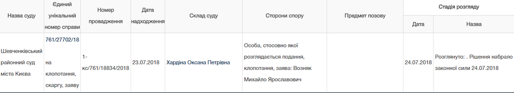 Портал "Судебная власть" содержит дополнительные данные, согласно которым в отношении Возняка 23 июля на рассмотрение судьи Оксаны Хардиной поступило некое ходатайство. Известно, что решение по нему было вынесено на следующий день и вступило в законную силу.