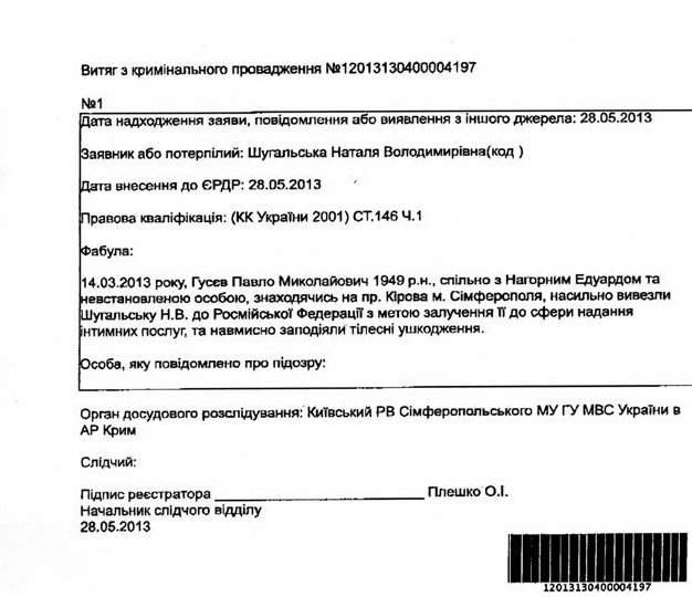 По их словам, 28 мая 2013 года в милицию обратилась Наталья Шугальская, которая сообщила о том, что ее выкрали из Симферополя, после чего доставили в Москву, где заставляли оказывать интимные услуги. Прочих подробностей девушка не рассказала, но, поведав историю своего таинственного спасения из борделя, назвала имена двух своих обидчиков. Ими оказались Эдуард Нагорный и главный редактор газеты "Московский комсомолец" Павел Гусев.