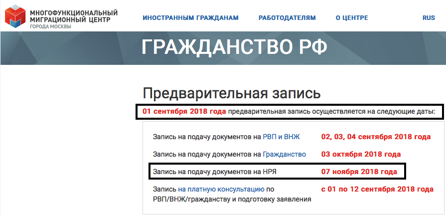 В реальности же за два месяца украинцу не то, что не выдадут паспорт, его даже не впустят в ФМС. На скриншоте с сайта миграционного центра по городу Москве видно: 1 сентября 2018 года проводилась запись на подачу документов на носителя русского языка только на 7 ноября.