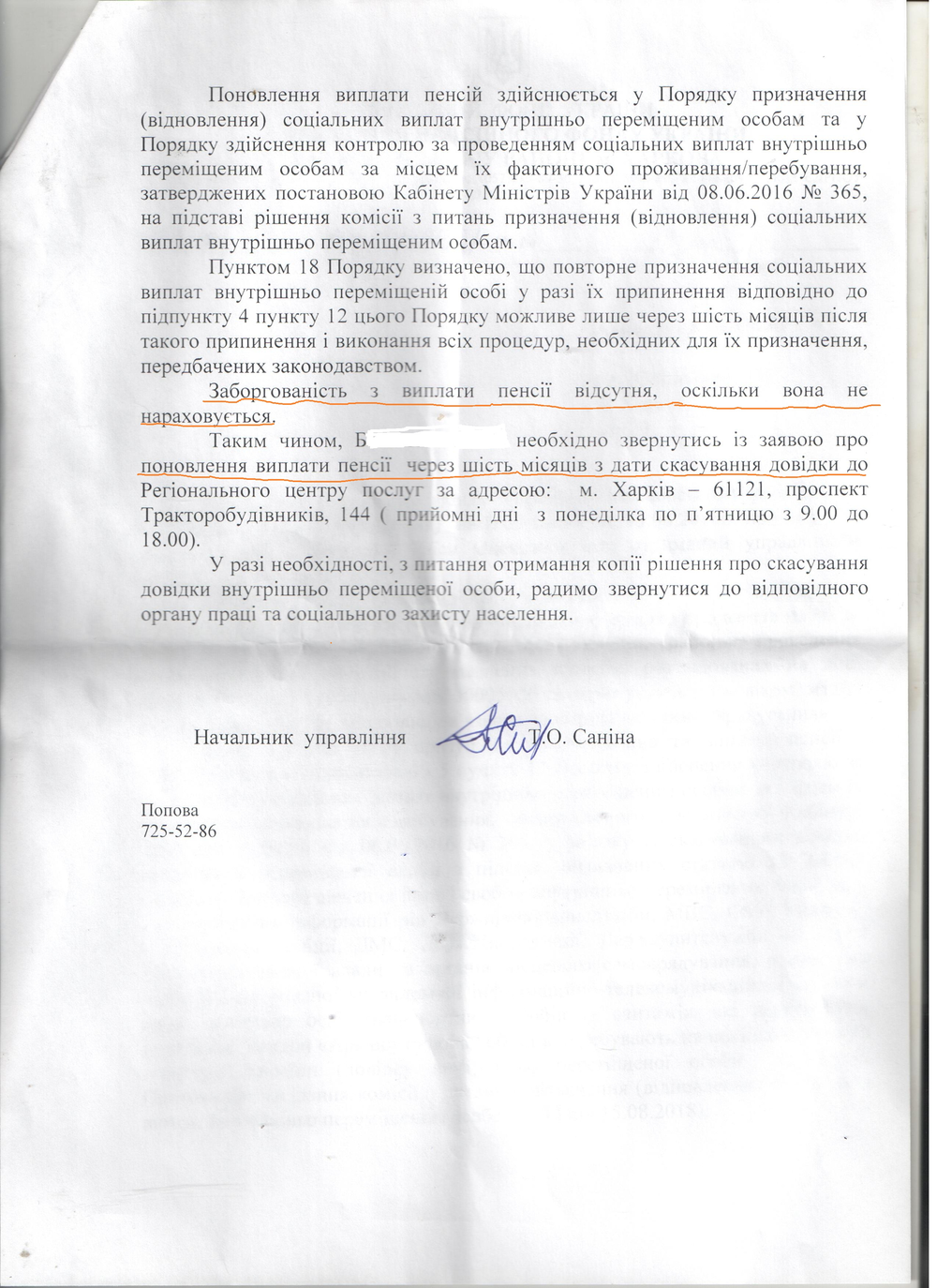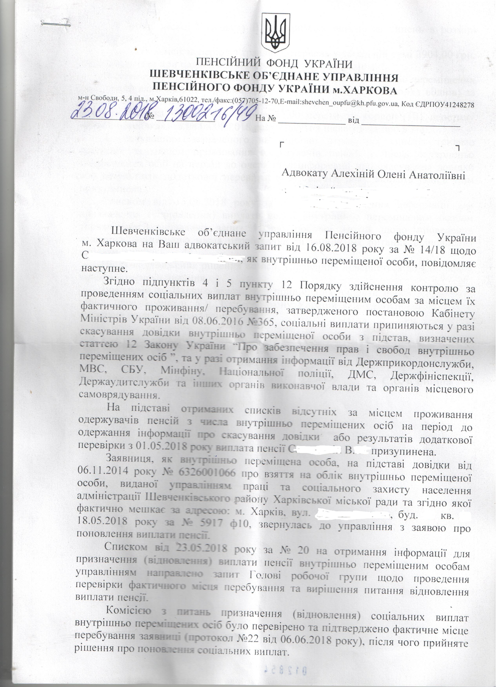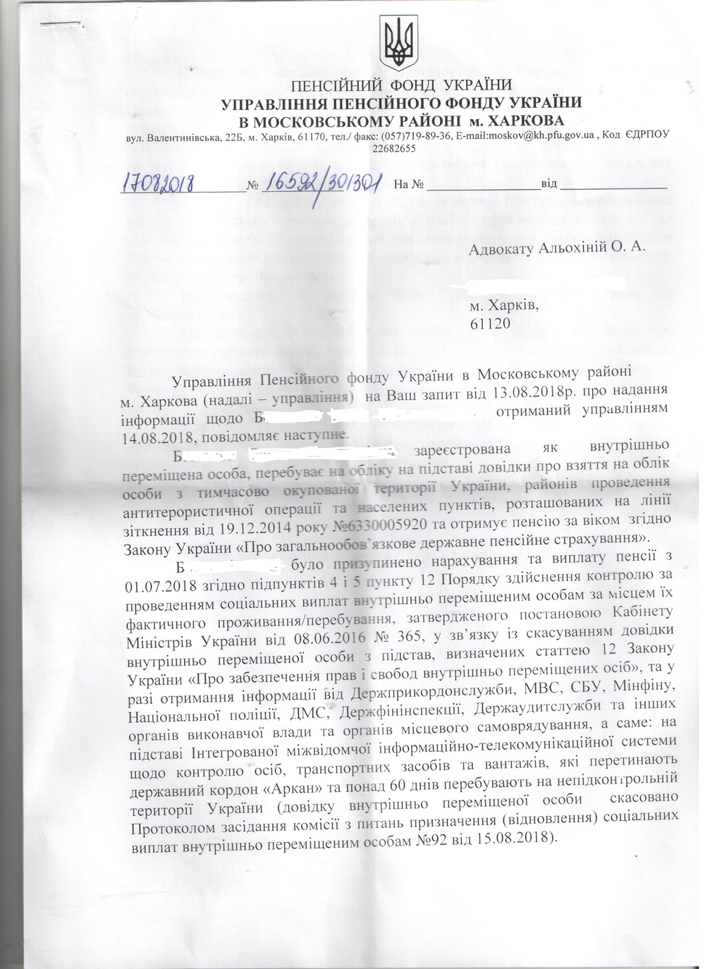 При этом чиновники "забыли", что пенсионерка затем приехала в Харьков, встала на учет как ВПЛ, и неоднократно подтверждала свое нахождение на контролируемой территории. А само районное управление Пенсионного фонда, которое дало ответ,  получило у нее документы на оформление пенсии, проверило трудовой стаж и приняло решение о назначении пенсии.