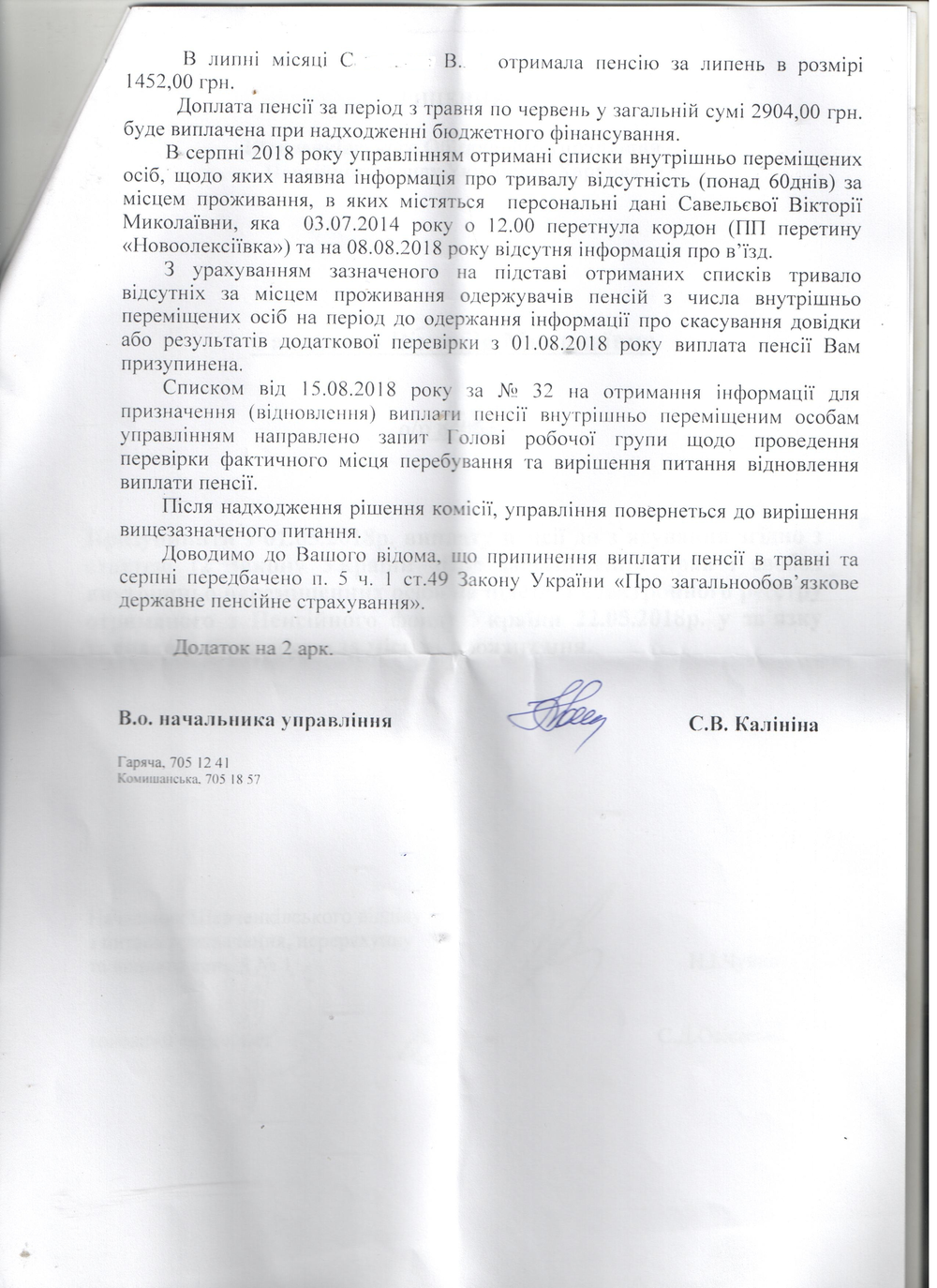 С августа пенсионерке вновь прекратили выплачивать пенсию. Основанием для невыплаты в Пенсионном фонде снова назвали информацию о длительном отсутствии (свыше 60 дней) по месту проживания как "временно перемещенного лица" (ВПЛ). Отсутствие по месту проживания обосновали тем, что пенсионерка еще в июле 2014 года пересекла линию разграничения через КПП "Новоалексеевка", а информация о ее обратном въезде якобы отсутствует: