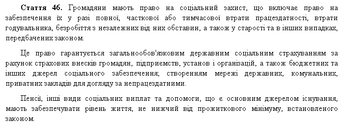Украинские законы, в отличие от подзаконных актов Кабмина, полностью на стороне пенсионеров. Согласно статье 46 Конституции, пенсия – это конституционное право пенсионера, а не просто социальная помощь от государства. Причем пенсии должны обеспечивать уровень жизни не ниже прожиточного минимума: