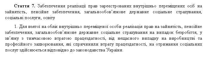 Право на получение пенсии переселенцам было подтверждено статьей 7 Закона "Об обеспечении прав и свобод внутренне перемещенных лиц". Причем им было гарантировано получение пенсий в соответствии с действующим законодательством: