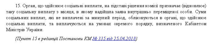 А 24 апреля этого года Кабмин постановлением № 335 внес изменения в этот Порядок. Теперь, после любого приостановления социальных выплат переселенцам (независимо от причин), возобновление выплат начинается только с момента их обращения с новым заявлением.