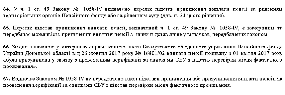 "Страна" недавно сообщала о решении Верховного суда, который миссия ООН упоминала в своем докладе о ситуации с правами человека в Украине. Согласно материалам судебного дела, 24 марта 2017 года Бахмутское управление Пенсионного фонда в Донецкой области приостановило выплату пенсии гражданке Украины, которая, по данным СБУ, проживала на неподконтрольной территории.