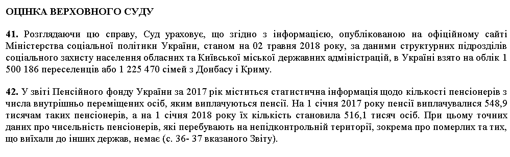 Еще Верховный суд привел в своем решении интересную статистику. Оказывается, по информации Минсоцполитики, по состоянию на 2 мая 2018 года в Украине учтено 1 500 186 переселенцев (или 1 225 470 семей) из Донбасса и Крыма. А пенсии выплачивались по состоянию на 1 января 2017 года 548,9 тысячам пенсионеров-ВПЛ, а на 1 января 2018 года их количество уменьшилось до 516,1 тысяч человек. При этом нет точных данных о численности пенсионеров, находящихся на неподконтрольной территории: