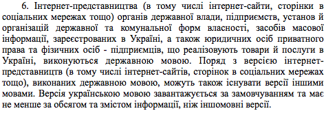 4. Сфера услуг – после принятия законопроекта предприятия и организации всех форм собственности, которые работают с клиентами и потребителями, должны осуществлять обслуживание на украинском языке. Это правило распространяется также на интернет-магазины и торговлю через интернет-каталоги. А обслуживание на другом языке возможно только по просьбе клиентов. Любые маркировки также должны будут стать доступны на украинском языке, причем шрифтом не менее, чем тот, что используется на языке оригинала.