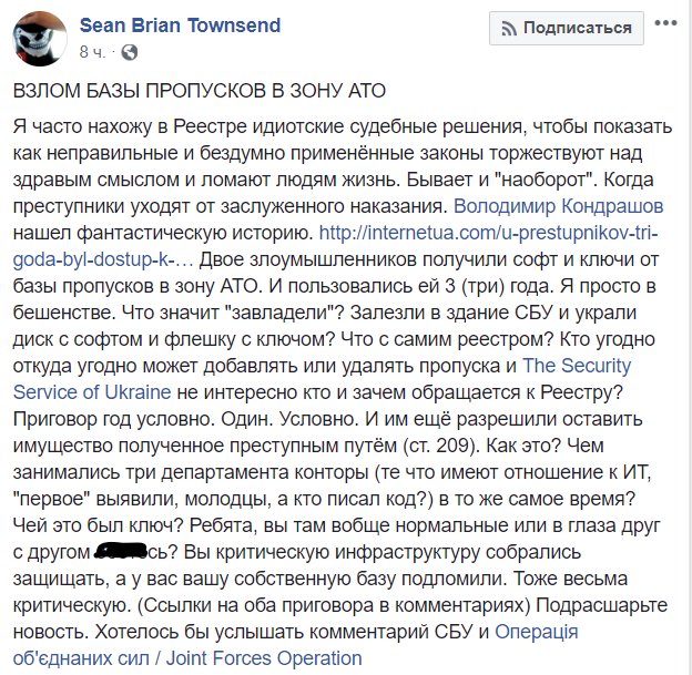 Вот что писал на этот счет пресс-секретарь Киберальянса - сообщества украинских хакеров, известный в сети под псевдонимом Sean Brian Townsend: "Я часто нахожу в Реестре идиотские судебные решения, чтобы показать как неправильные и бездумно применённые законы торжествуют над здравым смыслом и ломают людям жизнь. Бывает и "наоборот". Когда преступники уходят от заслуженного наказания. Владимир Кондрашов нашел фантастическую историю. Двое злоумышленников получили софт и ключи от базы пропусков в зону АТО. И пользовались ей 3 (три) года. Я просто в бешенстве. Что значит "завладели"? Залезли в здание СБУ и украли диск с софтом и флешку с ключом? Что с самим реестром? Кто угодно откуда угодно может добавлять или удалять пропуска и The Security Service of Ukraine не интересно кто и зачем обращается к Реестру? Приговор год условно. Один. Условно. И им ещё разрешили оставить имущество полученное преступным путём (ст. 209). Как это? Чем занимались три департамента конторы (те что имеют отношение к ИТ, "первое" выявили, молодцы, а кто писал код?) в то же самое время? Чей это был ключ? Ребята, вы там вообще нормальные или в глаза друг с другом @#@$есь? Вы критическую инфраструктуру собрались защищать, а у вас вашу собственную базу подломили. Тоже весьма критическую".