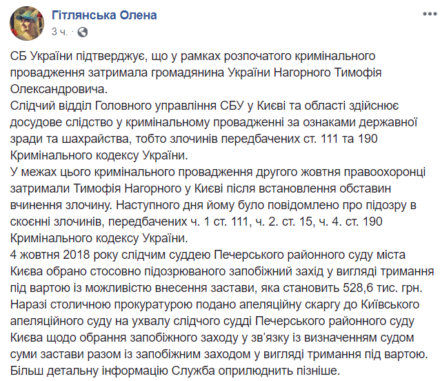 В ведомстве Василия Грицака на этот счет органичились лишь ремаркой, что задержание руководителя "Фонда волонтеров" Украины состоялось "после установления обстоятельств совершения преступления". Оперировали ли при этом силовики ст.208 УПК или иной нормой законодательства, остается невыясненным. Но исходя из публично озвученных формулировок Нагорному спецслужбы инкриминируют совершение государственной измены (ч.1 ст.111 УК Украины) и мошенничество в особо крупных размерах (ч.4 ст.190 УК Украины).