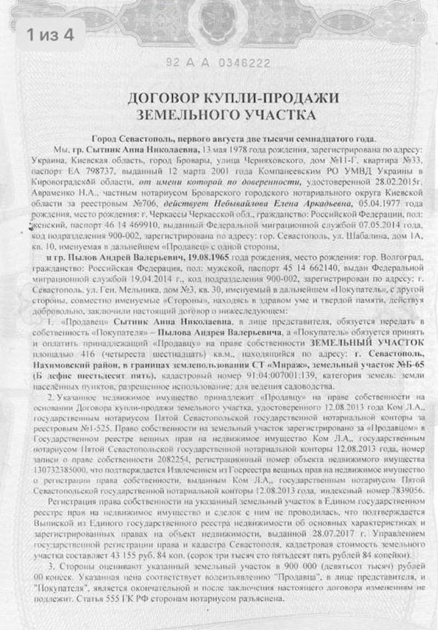 Как следует из обнародованных Ивановым документов, сделка купли-продажи была проведена в соответствии с законодательством РФ крымским нотариусом Эллой Руденко. При этом 6600 рублей ушли в казну "северного соседа" Украины. А главное - в процессе отчуждения было нарушено законодательство нашей страны.