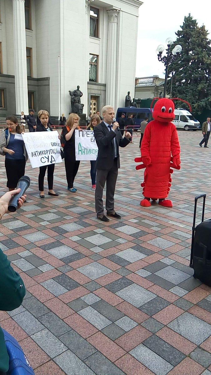1 июня 2016 года с десяток активистов финансируемых за счет грантов Запада общественных организаций во главе с руководителем "Центра противодействия коррупции" Виталием Шабуниным, привели под стены парламента человека, на котором был надет костюм рака.