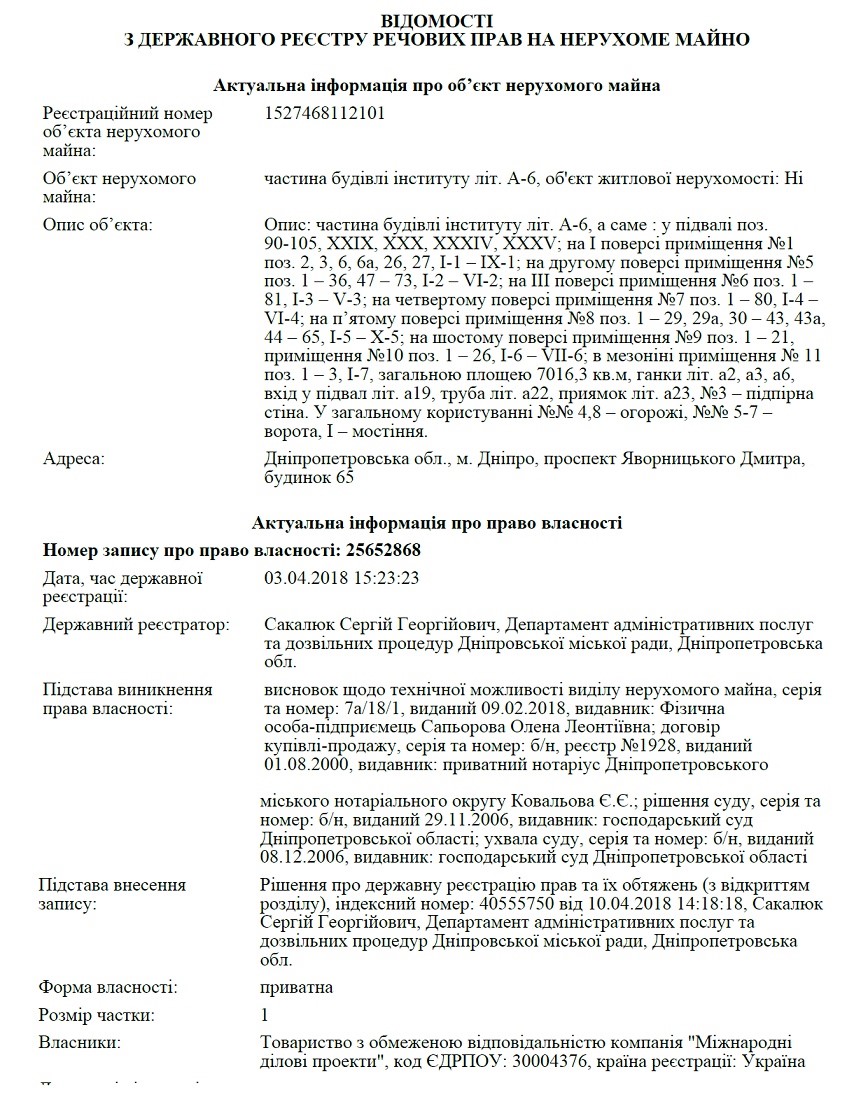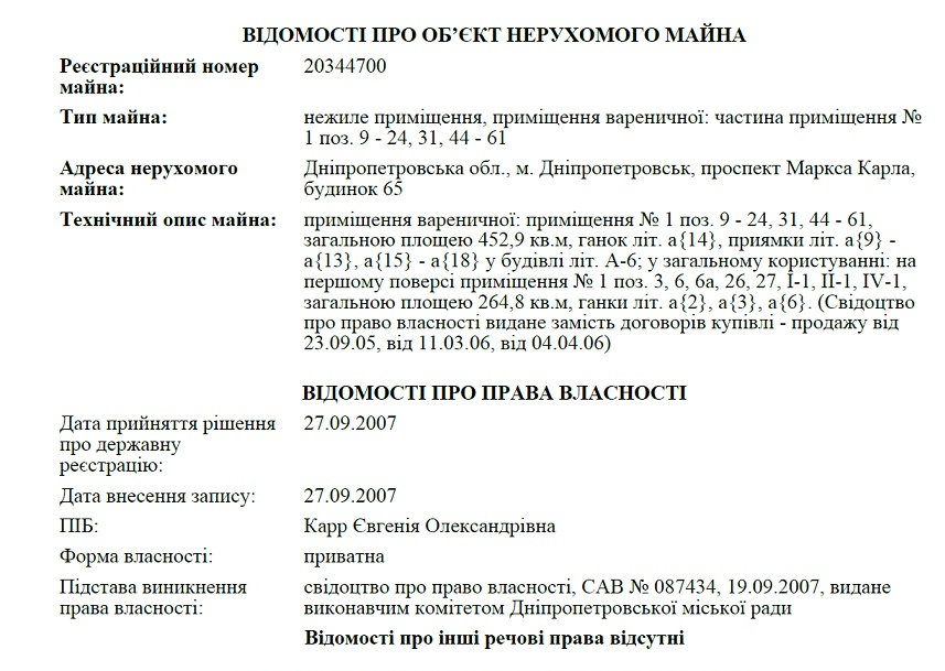 Еще семье Тимошенко принадлежит почти все 6-этажное здание в самом центре Днепра, на проспекте Яворницкого (бывший Карла Маркса), 65. Помещения были выкуплены еще в 2000 году у государственного НИИ механизации труда в черной металлургии.