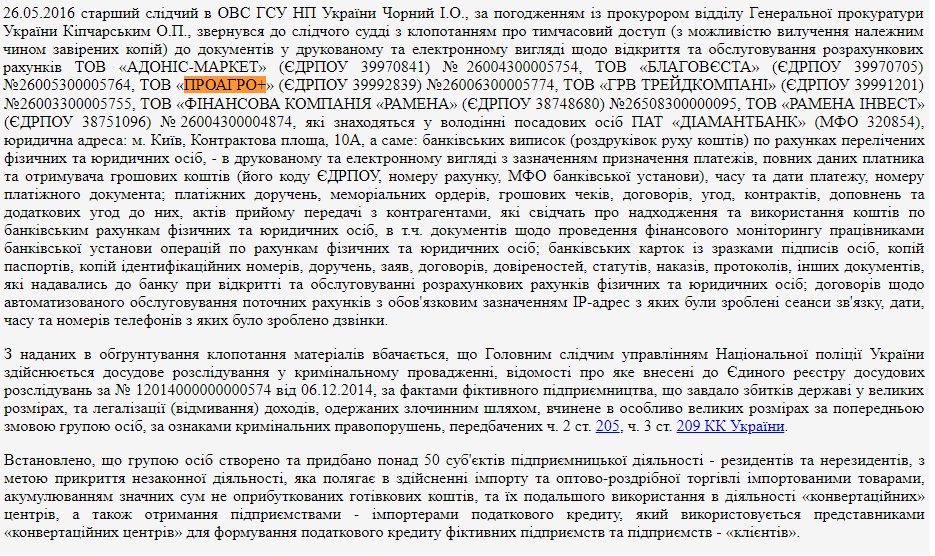 Более подробно сутьпредполагаемой преступной деятельности раскрыта в определении Печерского суда Киева, где фигурирует ООО "Проагро+", где учредитель и директор – все тот же Алексей Каменев, связанный совместным бизнесом с семьей Тимошенко.