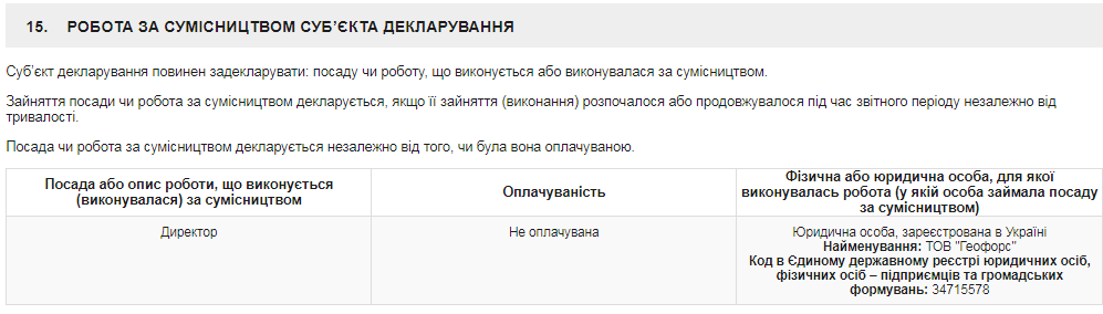 Тем не менее, директор "Геофорса" Ольга Шевченко работает на фирме совершенно бесплатно. Именно это она сообщила в своей декларации за 2017 год. А основным местом ее работы была должность главного бухгалтера государственного предприятия "Предприятие по обеспечению нефтепродуктами" в Киеве: