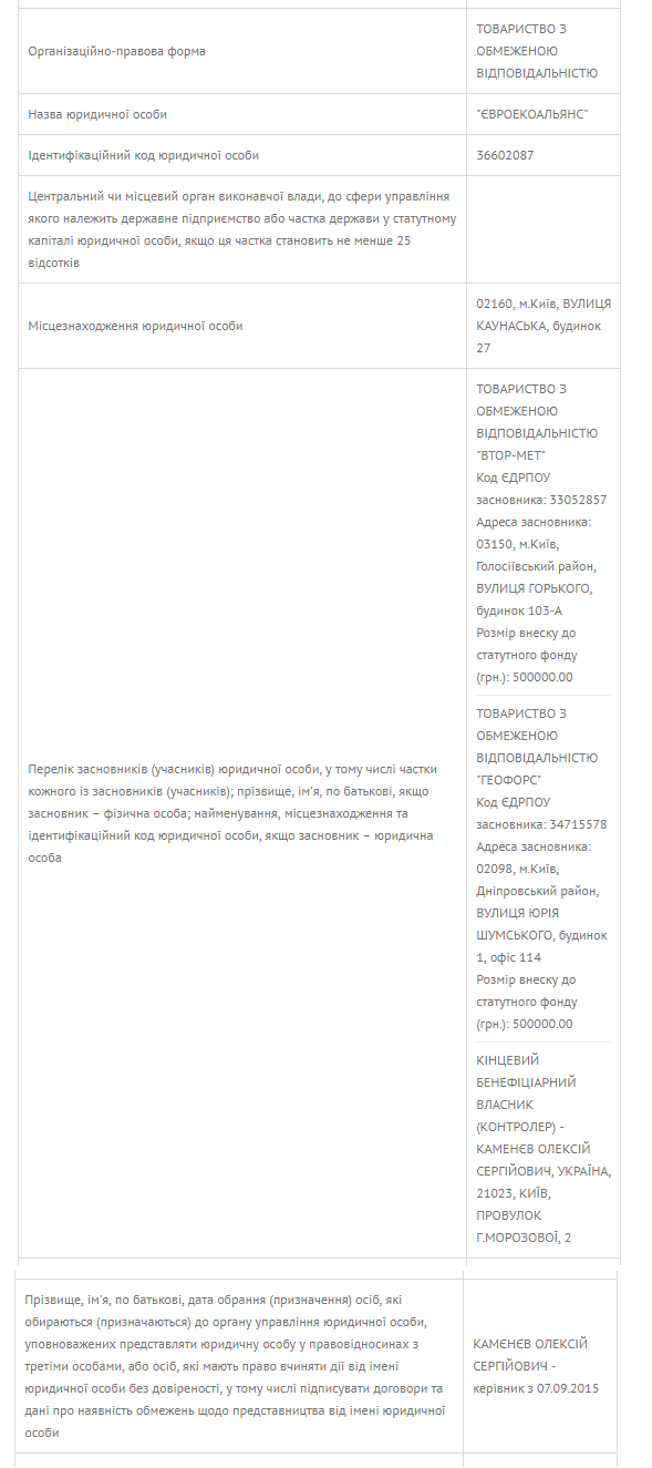 Еще "Геофорс" владеет половиной другой фирмы – ООО "Евроэкоальянс". Второй совладелец фирмы, согласно данным из реестра юридических лиц, – ООО "Втор-Мет".
