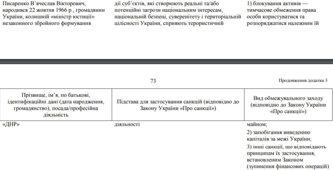 Именно так объяснялся факт внесения отставного милиционера в санкционные списки СНБО в 2016 году под №167. В аналогичных документах, визированных Порошенко в 2017 и 2018 годах, порядковый номер Писаренко - 511. Во всех этих официальных бумагах Вячеслав Викторович именуется как бывший "министр юстиции" т.н. ДНР.