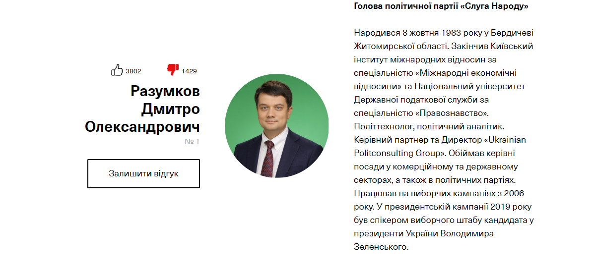 “На третьем этапе (постпраймериз - При.ред.) мы предлагаем загрузить информацию о кандидате, который, по вашему мнению, не достоин быть в списке. Функция "дизлайк" будет недоступной без подкрепления реальными фактами о недобросовестности кандидата”, - заявил лидер партии Дмитрий Разумков.