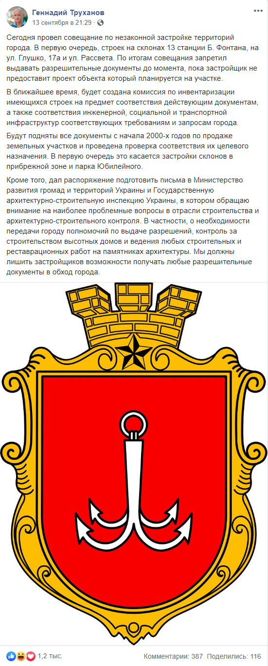 Будут подняты все документы с начала 2000-х годов по продаже земельных участков и проведена проверка соответствия их целевого назначения. В первую очередь это касается застройки склонов в прибрежной зоне и парка Юбилейного", - гласит пост на странице мэра.