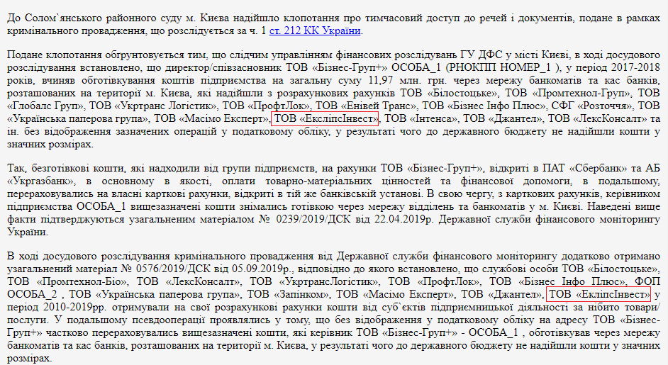 Также по делу по "обналу" и уклонению от уплаты налогов проходит фирма "Эклипс инвест", заплатившая партии Порошенко 3 миллиона.  В одном из определений Соломенского райсуда Киева говорится, что, по данным  Госфинмониторинга должностные лица "ЭклипсИнвест" в период 2010-2019 гг. получали на свои расчетные счета средства от субъектов предпринимательской деятельности якобы за товары/услуги. В дальнейшем средства частично перечислялись без отражения в налоговом учете, и руководитель "обнальной" конторы обналичивал их через сеть банкоматов и касс банков, расположенных на территории м. Киева, в результате чего в государственный бюджет не поступили средства в значительных размерах: