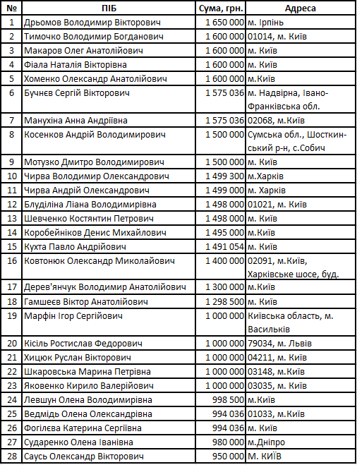 Наибольшие взносы в сумме 35 млн заплатили всего 22 человека, по 1,6 млн каждый. Остальные суммы не превышали 150 тысяч гривен.