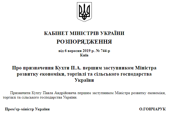 Среди крупных спонсоров "Голоса" (взнос почти 1,5 млн) оказался Павел Кухта. Его включили в список кандидатов от "Голоса" под № 25. В парламент он не прошел, но зато в сентябре Кабмин премьера Гончарука назначил Павла Кухту первым заместителем министра экономики Тимофея Милованова: