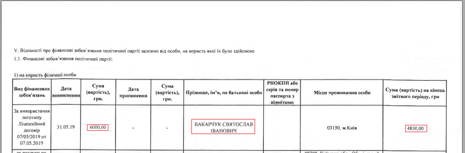 А еще партия осталась должна своему лидеру 4830 грн за право использования логотипа. Всего лицензионный договор между "Голосом" и Святославом Вакарчуком был заключен на сумму 6000 грн: