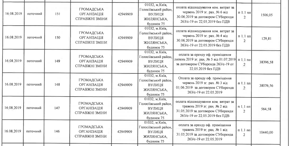 От вождя не отставали и приближенные. На общественную организацию "Справжні зміни" были уплачены 89 тыс грн. партийных денег за аренду помещения площадью 50 "квадратов" в Киеве по ул. Жилянской, 75. Ежемесячная арендная плата там составила больше 38 тыс. грн: