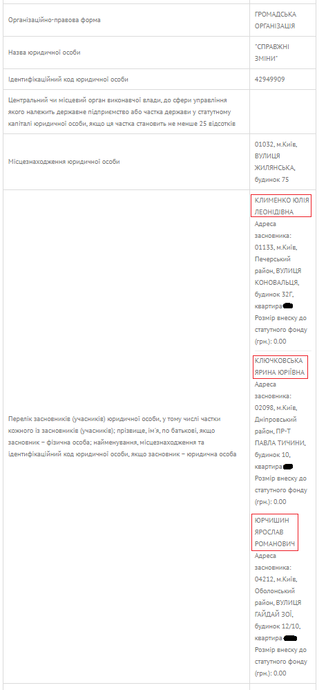Учредителями "Справжніх змін", согласно данным реестра юридических лиц, являются Юлия Клименко (№ 2 в списке "Голоса"), Ярослав Юрчишин (№ 7) и Ярина Ключковская (№ 32). Клименко и Юрчишин в итоге стали народными депутатами по списку партии "Голос":