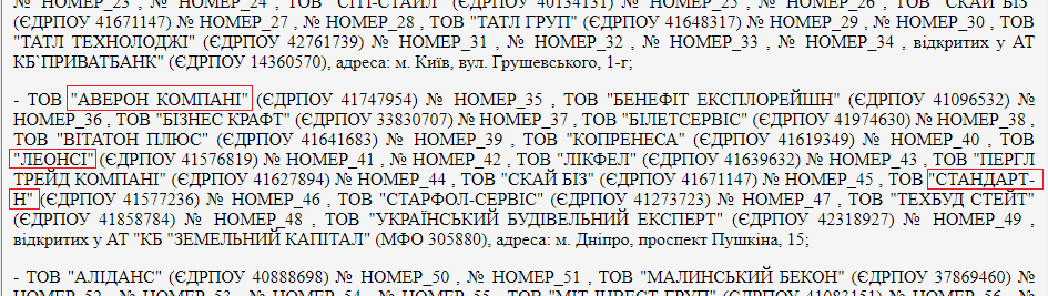 Первые четыре фирмы нигде особо не "засветились", поскольку были созданы относительно недавно. А вот три следующие компании "Стандарт-Н", "Леонси" и "Аверон компани", прописанные в Николаеве, проходят по одному уголовному производству № 42017000000004297 по отмыванию средств и уклонению от уплаты налогов в особо крупных размерах, которое ведет Государственное бюро расследований. Об этом сказано, например, в одном из определений Киевского апелляционного суда: