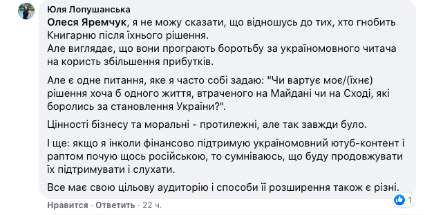 “Сотни моих френдов написали оскорбительные и отчаянные комментарии о книжном магазине, который решил продавать российские книги. Меня это решение тоже разочаровало. Но по другим причинам. 80% украинцев за год не купили ни одной книги, — пишет Кипиани на своей странице в фейсбуке. — В этой ситуации бизнес, который сам себя ограничил украиноязычной аудиторией априори проигрывает. Потому что есть такая наука арифметика. «Да мало нас». И этот момент непременно должен был наступить — либо закрыться, либо измениться. Это очень обидно. Но коллективное самоубийство с пожеланием сети умереть и обещаниями не покупать там ничего просто приблизят ее смерть.