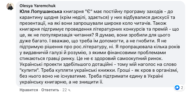 В защиту “Книгарні Є” выступил также журналист Вахтанг Кипиани. Он написал, что понимает решение магазинов продавать русскоязычные книги — для них это вопрос выживания.
