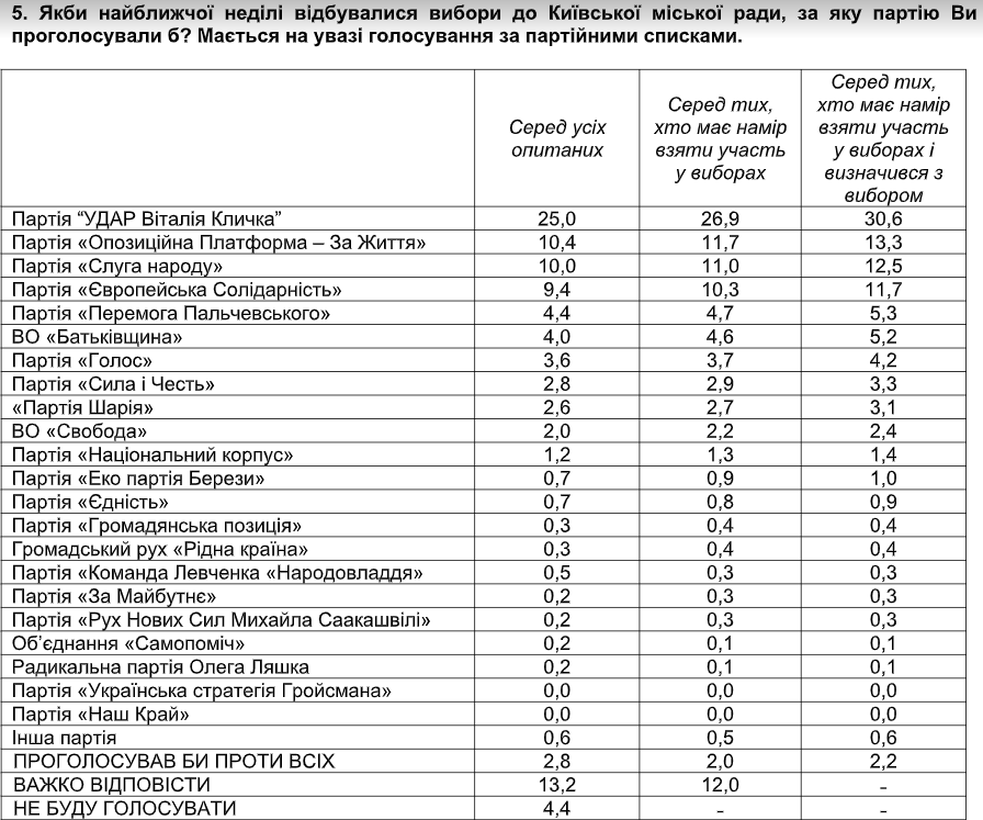 Оба исследования показывают, что электоральный пирог "Европейской солидарности" надкусила партия "Голос", выдвинувшая в мэры известного шоумена Сергея Притулу. Также многие сторонники партии Порошенко готовы голосовать за "удар" Кличко.