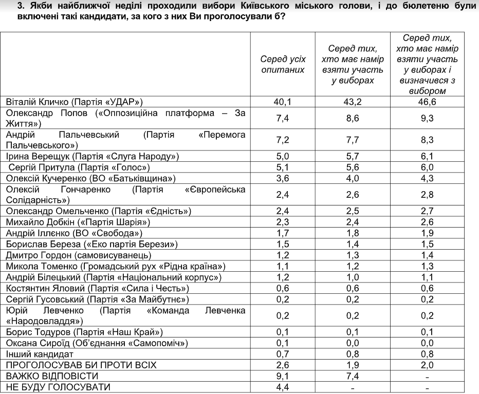 Соцопрос "Рейтинга" показывает, что второй пул кандидатов имеет примерно одинаковый рейтинг, в рамках статистической погрешности. 9,8% могли бы поддержать Притулу, 6,9% - Ирину Верещук, 6,4% - Андрея Пальчевского, 5,8% - Алекандра Попова, 5,7% - Алексея Кучеренко. Еще около 11% киевлян не определились, за кого будут голосовать на выборах мэра.