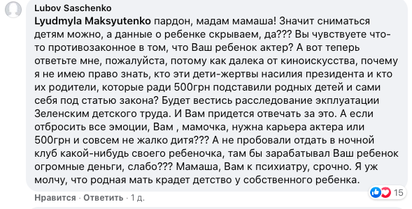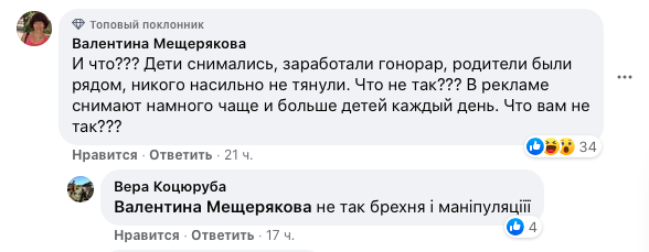 "Дети снимались, заработали гонорар, родители были рядом, никого насильно не тянули. Что не так? В рекламе снимают намного чаще и больше детей каждый день. Что вам не так?" – пишет одна из пользовательниц.
