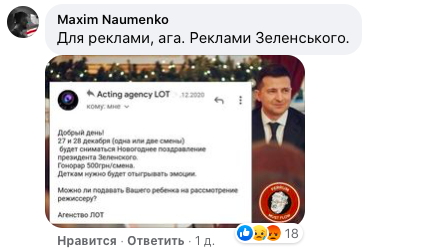 Впрочем, как выяснилось позже, маленьких актеров отбирали не для рекламы, а для съемок новогоднего поздравления президента Украины Владимира Зеленского. То есть, как подметили многие комментаторы, для рекламы президента.
