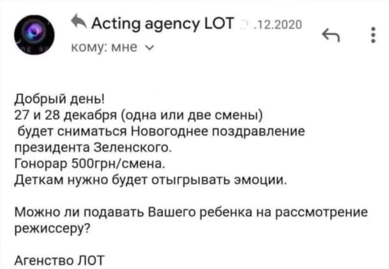 В личных переписках с родителями, которые заинтересовались съемками, представители агентства LOT уточняли, что на самом деле будет "сниматься новогоднее поздравление президента Зеленского". А "деткам нужно будет отыгрывать эмоции".