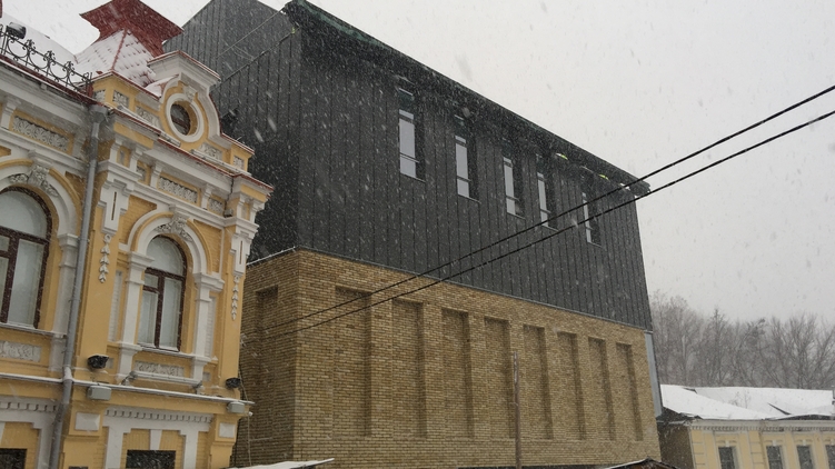 На заснеженном Андреевском спуске у задрапированного здания, резко контрастирующего с другими по стилю и высоте, собираются люди. Накануне столичный фейсбук гудел от возмущения: посреди легендарного Андреевского спуска как снег на голову выпал черный куб.