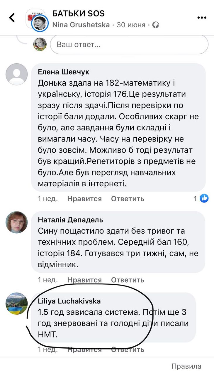 В профильных родительских группах в Фейсбуке – сотни жалоб на такие же сбои при проведении НМТ в разных городах Украины.
