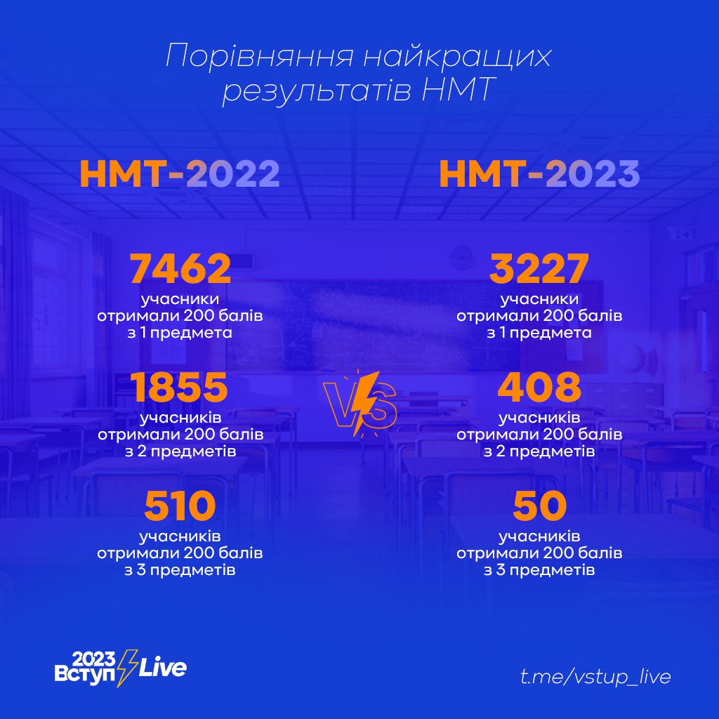 Не исключено, что в том числе из-за массовых сбоев в системе НМТ результаты тестирования абитуриентов в этом году оказались намного ниже прошлогодних. Для сравнения, в 2022 году 7462 выпускника получили максимальные 200 баллов по одному предмету, а в 2023 году таких оказалось только 3227. И всего 50 выпускников набрали 200 баллов по трем предметам, тогда как в прошлом году наивысший результат получили 510 учеников.