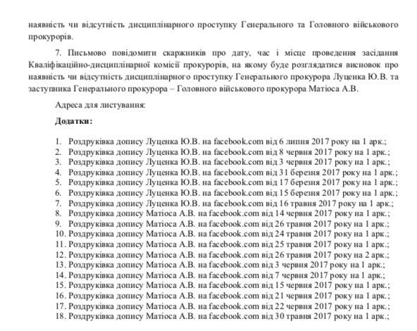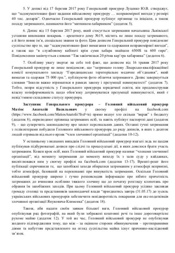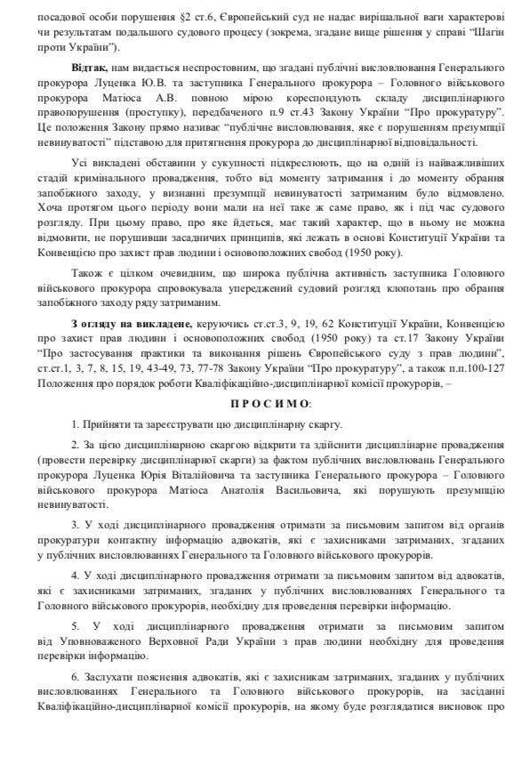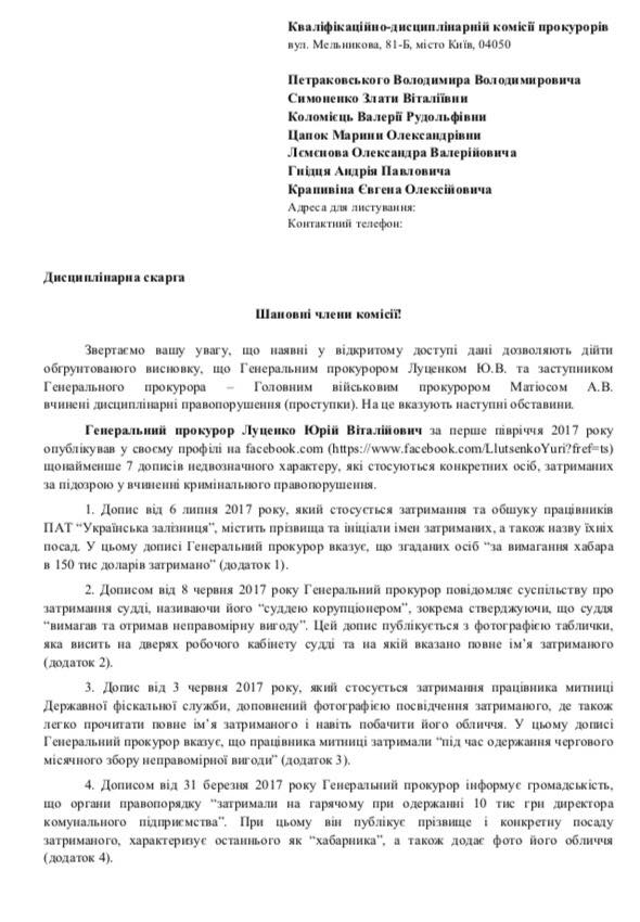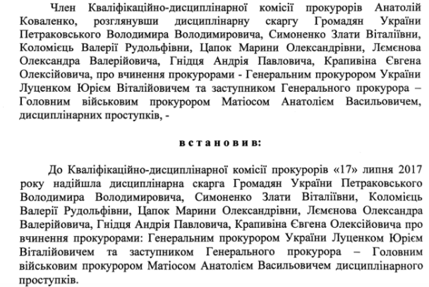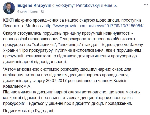 Основанием для открытия дисциплинарного производства в отношении генпрокурора стала жалоба, направленная КДКП инициативной группой юристов 20 июля. В числе ее инициаторов - все те же Петраковский и Симоненко, а также еще пятеро их коллег: Марина Цапок, Валерия Коломиец, Александр Леменов, Андрей Гнидец и Евгений Крапивин. Они подсчитали, что только с начала нынешнего года генпрокурор допустил нарушение презумпции невиновности в семи постах на своей странице в Facebook, а Матиос - в одиннадцати.