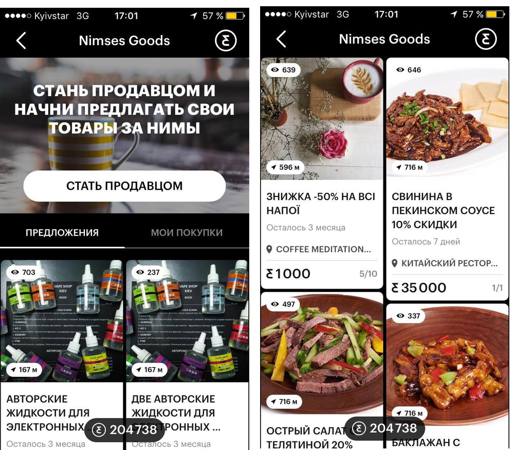 Постепенно разработчики внедряют в приложение возможность расплачиваться нимами за реальные товары в подразделе приложения Nimses – сервисе Nimses Goods, своеобразной таргетинговой площадке для бизнеса. Грубо говоря, магазин создает в сервисе свое предложение – к примеру, бутылка воды за такое-то количество нимов, – и сообщение об этом в виде рекламы видят пользователи приложения, которые находятся рядом с этим магазином.