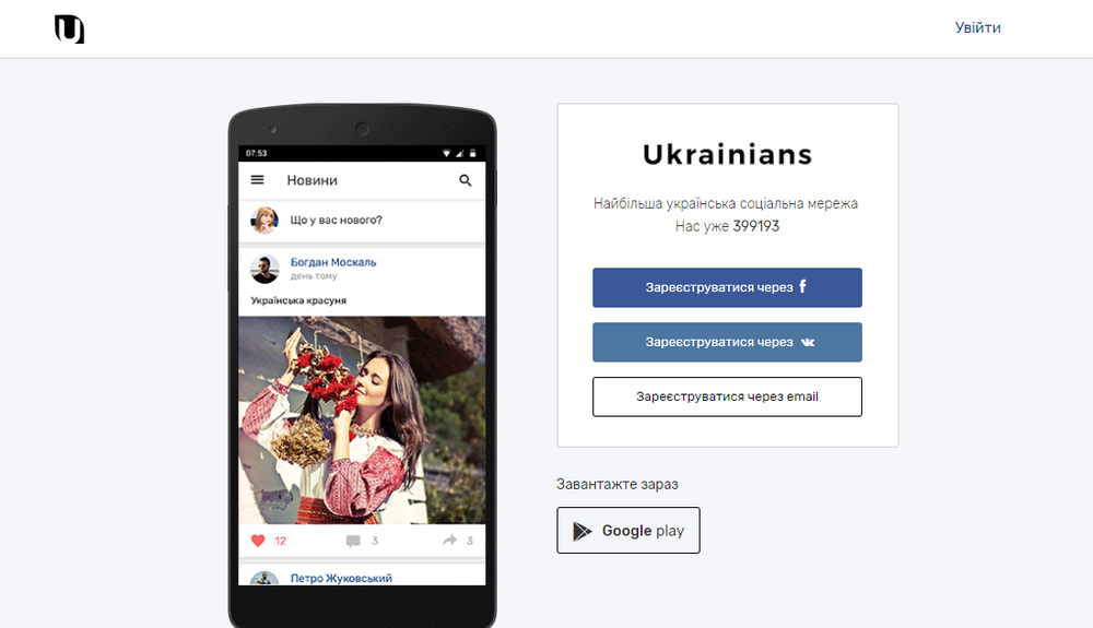 Что это? Классическая социальная сеть для общения, по интерфейсу очень напоминает запрещенный в Украине "Вконтакте". Создатели позиционируют Ukrainians как национальный продукт – для украинцев и на украинском. Тут название говорит само за себя.