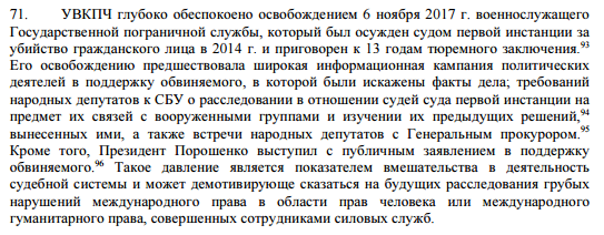 Миссия ООН также глубоко обеспокоена освобождением пограничника Колмогорова, который был осужден судом первой инстанции за убийство в 2014 г. под Мариуполем гражданского лица и приговорен к 13 годам тюремного заключения.